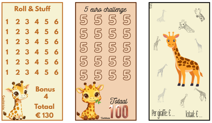 Een PDF als A4 formaat met een drietal challenges met een giraffen thema. De drie challenges hebben alledrie een formaat voor in een A6 binder.